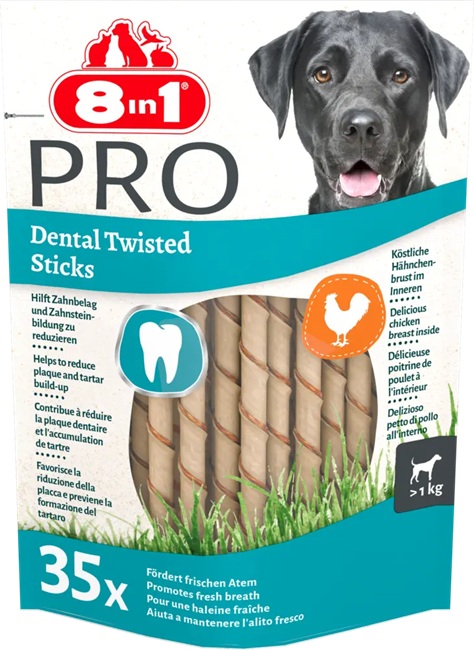 The 8in1 PRO Dental Twisted Sticks are the ideal combination of long-lasting chewing fun with dental care! Delicious chicken breast is wrapped in tough beef hide, with added anti-plaque formula and teeth-cleansing minerals. These tasty chews help to reduce plaque and tartar build-up by the natural abrasive action of chewing and also promote fresher breath. These products will provide a natural chewing experience, free from any flavour enhancers or colourings. They provide the perfect match of chewing fun and a dog treat, ideal for in-between your dog’s meals and to fight against boredom. The 8in1 Pro Dental Twisted Sticks will keep your dog happily busy and ensure intensive chewing fun to enhance dental care until the last bite.