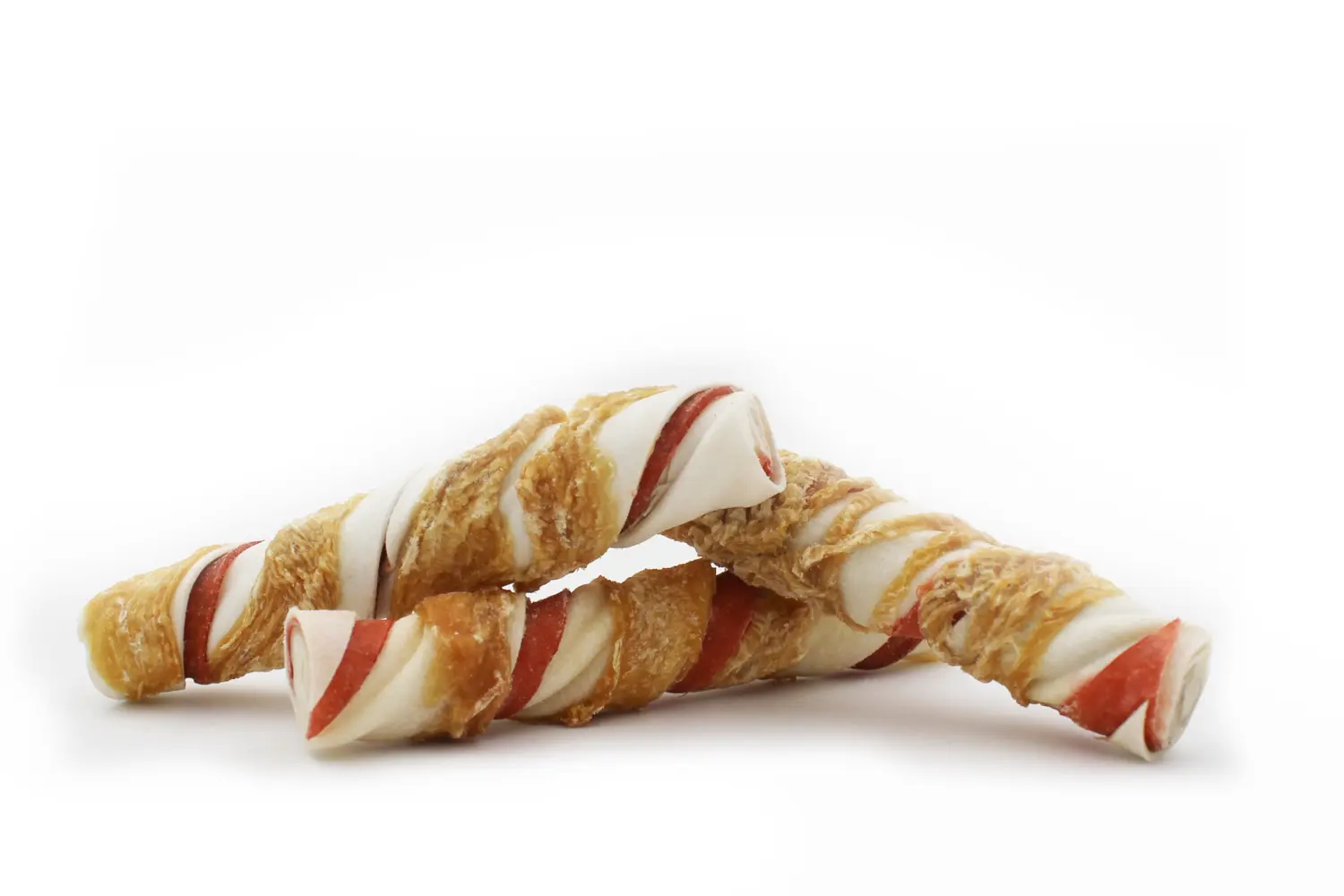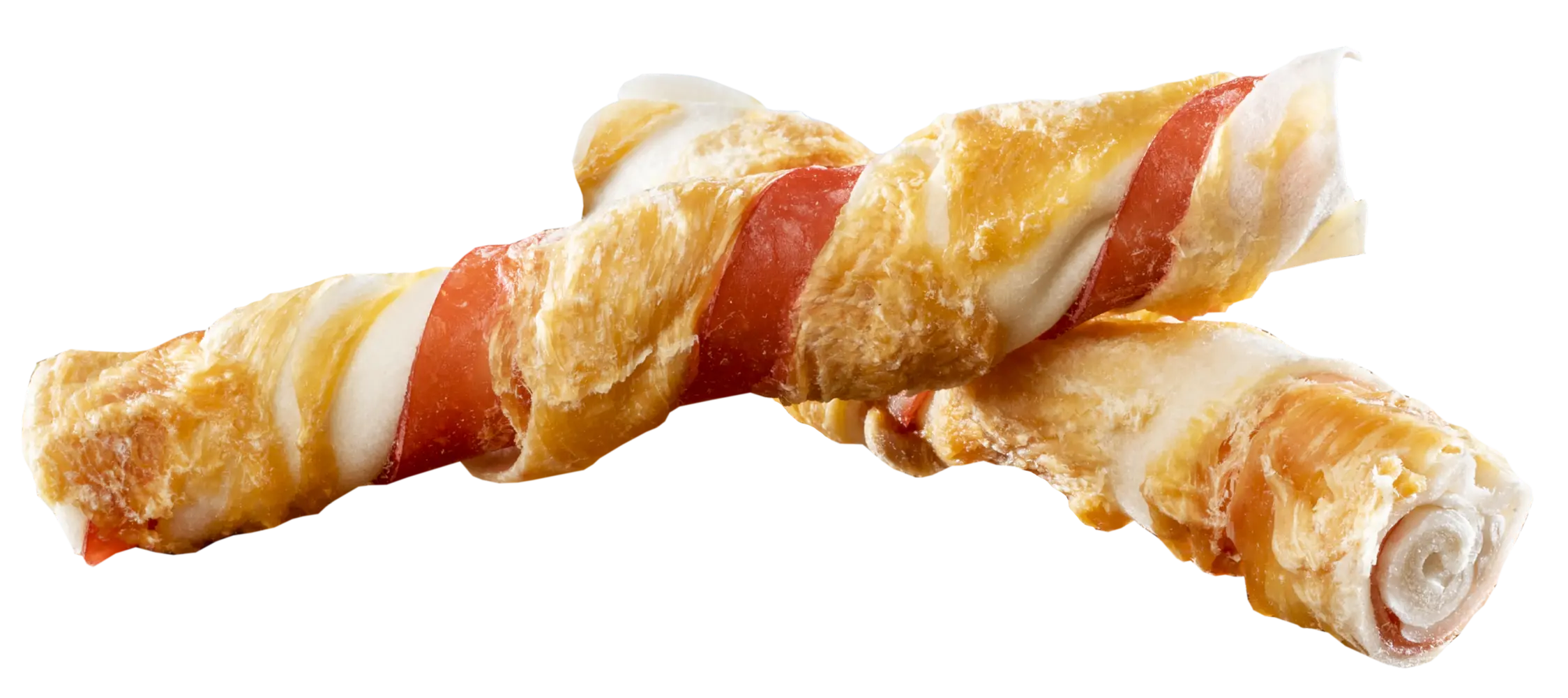 Delicious, chewy rolls: pork hide and beef hide wrapped with delicious chicken breast to keep your dog busy