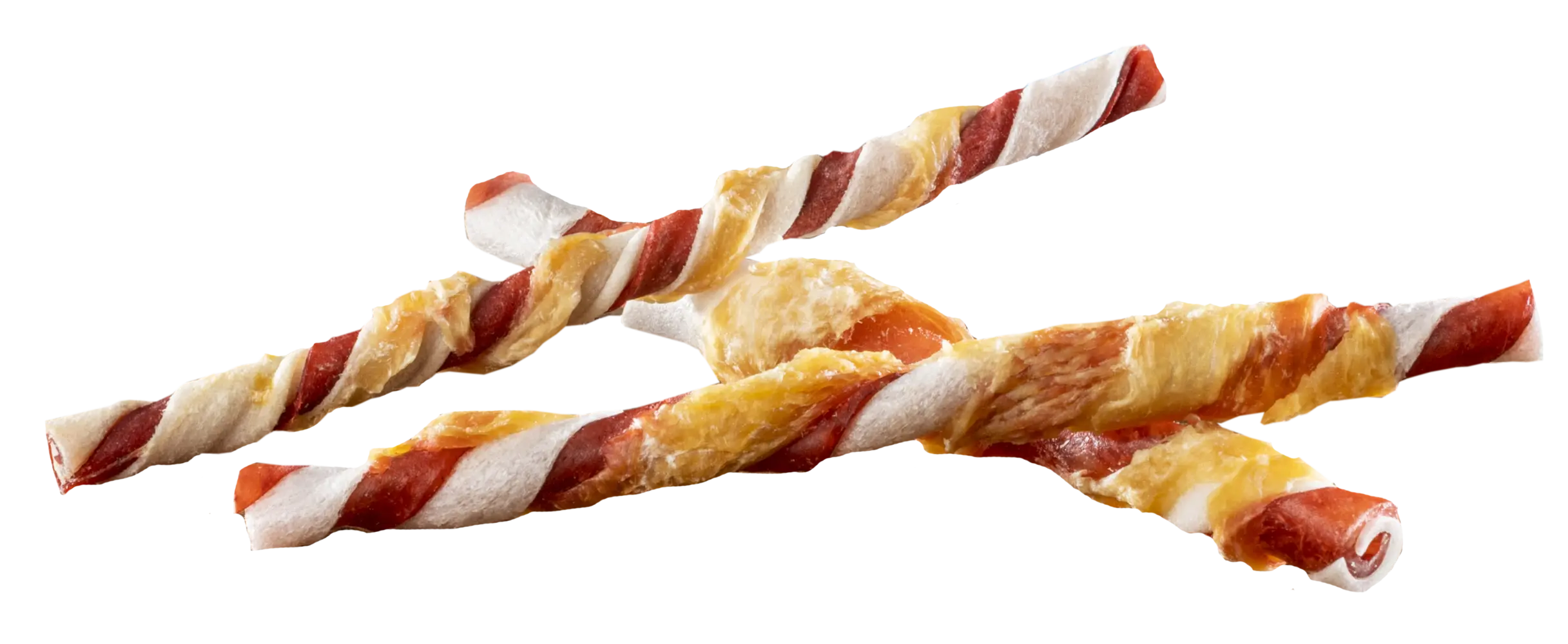 Delicious, chewy twisted sticks: pork hide and beef hide wrapped with delicious chicken breast to keep your dog busy