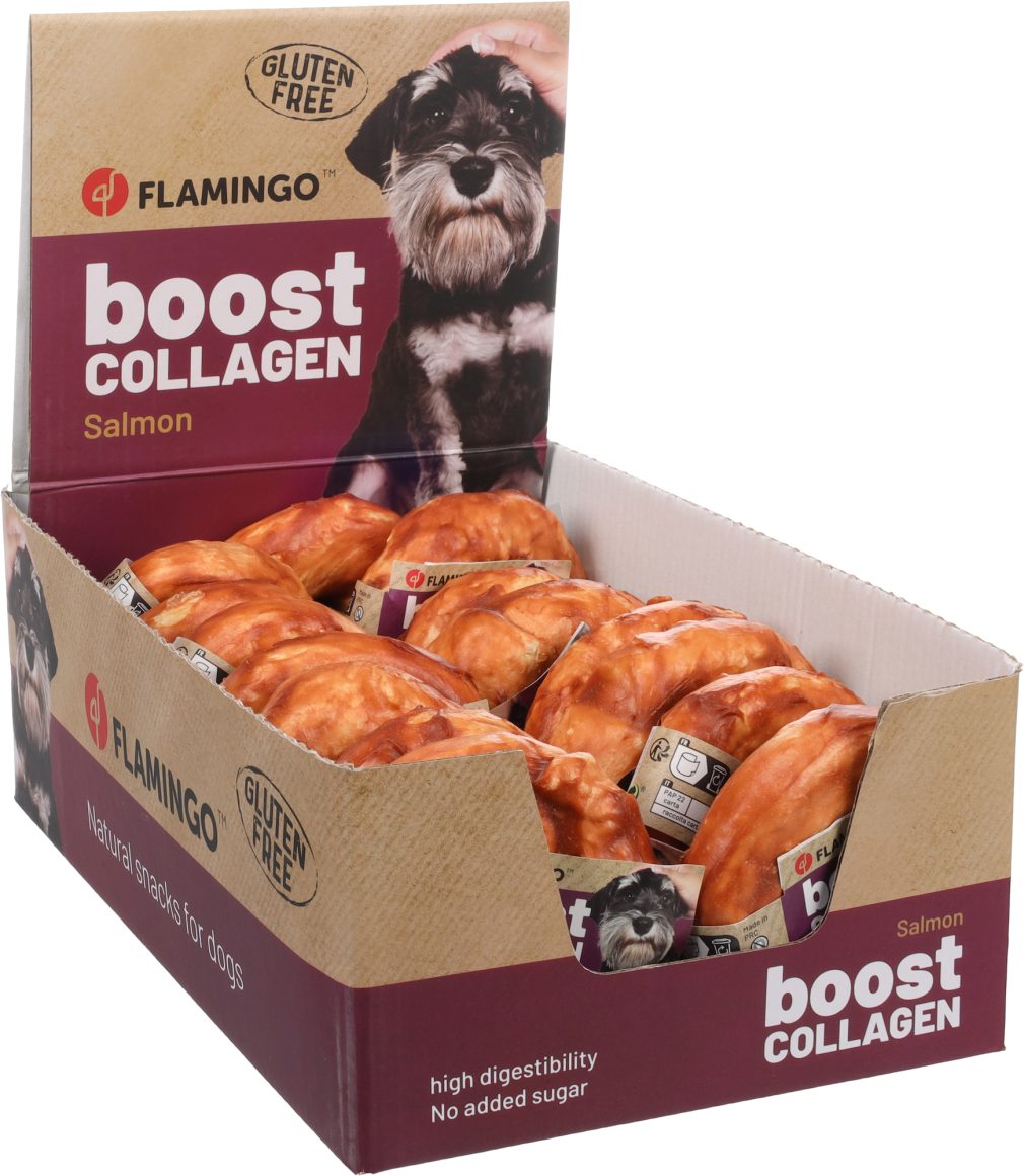 Treat your dog to our Snack Boost Ring Salmon & collagen! Gluten-free and no added sugars. Packed with collagen for a healthy skin, joints, and a shiny coat.