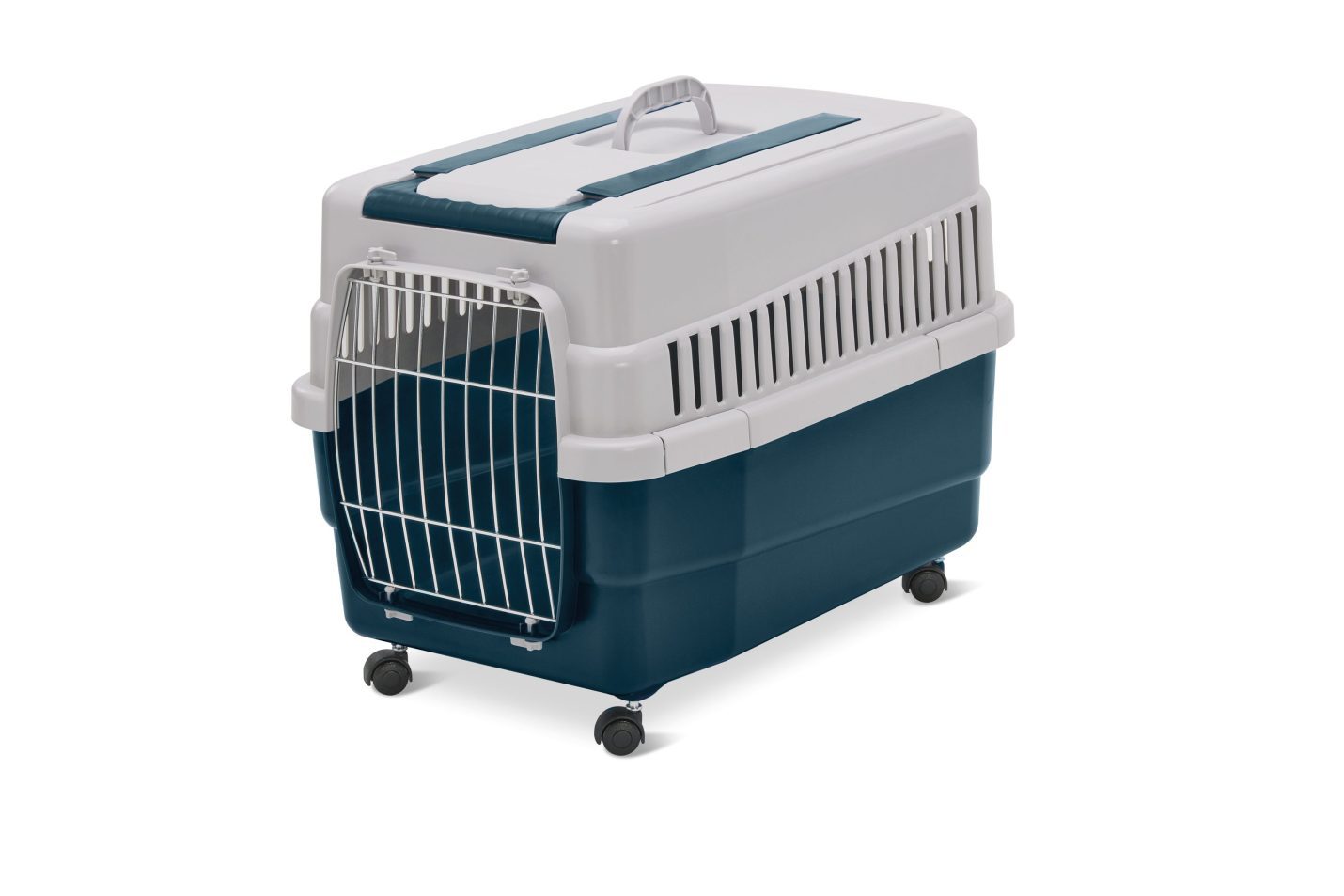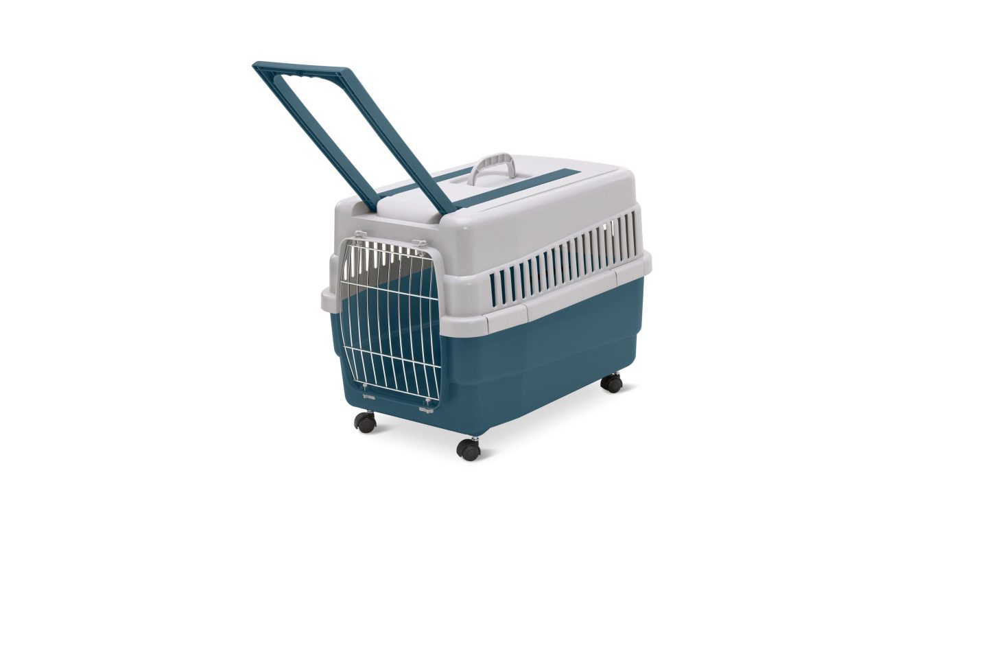 Choosing the Kim 60 dog and cat carrier combines the safety of your pet with the convenience of carrying it. Made of solid plastic this carrier is very functional. In fact it is equipped with a retractable fixed handle and a removable and extendable handle and thanks to the four pivoting wheels on the bottom, you can use your pet carrier like a trolley. The side grilles and the metal door allow proper ventilation. The safe side clips ensure easy hooking and unhooking for perfect cleaning of the carrier. Choose the medium-sized plastic carrier for cats and dogs that suits your needs.
