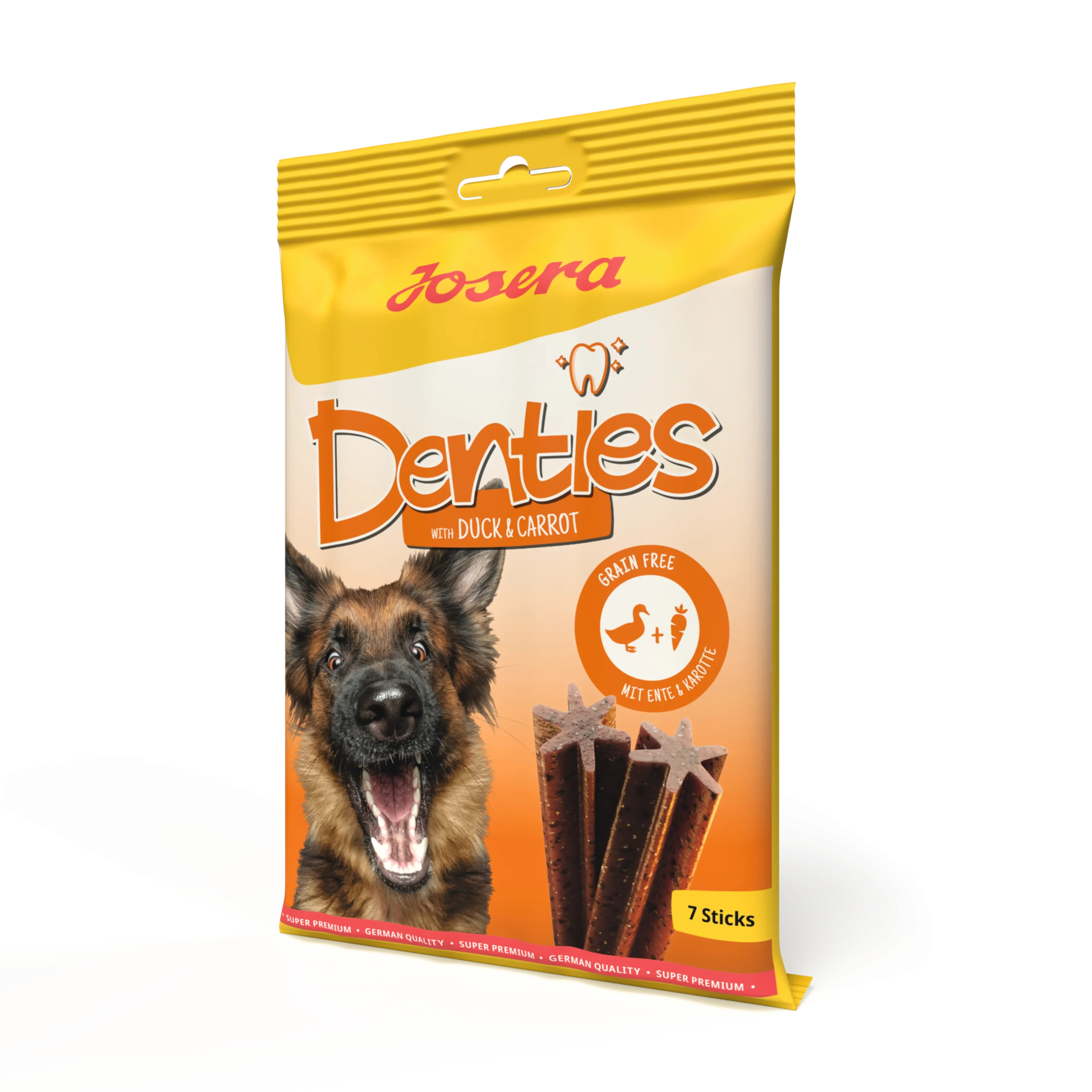 Brushing teeth, except much tastier: our new Josera Denties chews make dental care your dog’s favourite hobby! The cellulose in Josera Denties Duck & Carrot ensures enjoyable dental care — thanks to its composition, this ingredient helps daily teeth cleaning. Delicious duck and carrot provide an unbeatable taste.