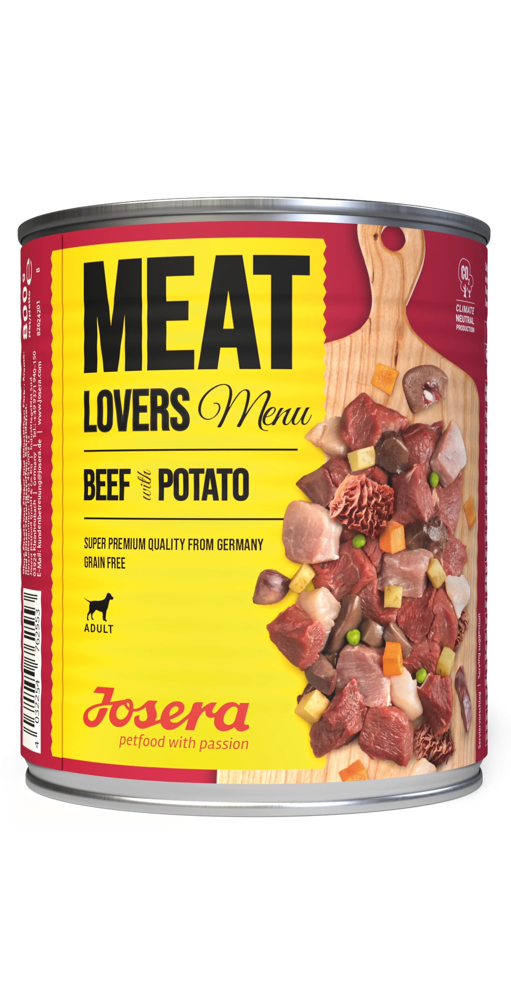 Are you wondering what is in the can for our Menu Beef with Potato? Just take a closer look – we make no secret of the fact that our super premium wet food contains exactly what genuine meat lovers want to see in their dog bowl. Our delicious grain free and gluten free recipe with beef and potatoes comes with added meat – beef, chicken and pork create a wonderfully succulent mixture. Potatoes, carrots and peas provide a varied accompaniment. With absolutely no added sugars, colorings, flavorings or preservatives.