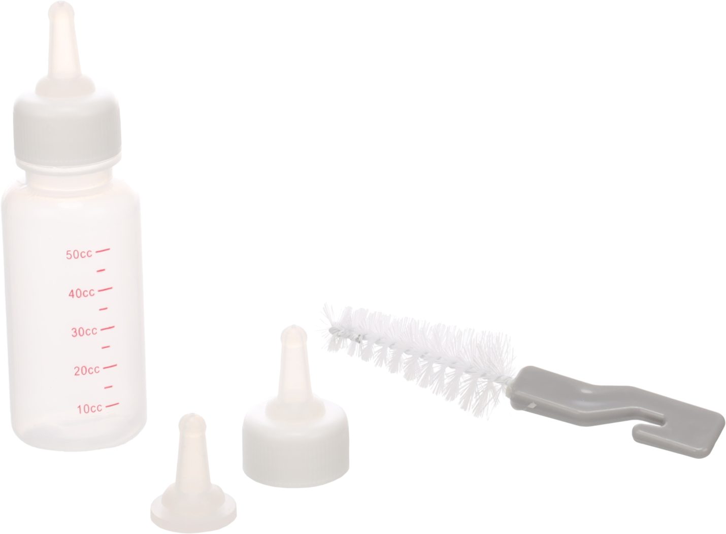 This adorable plastic bottle is perfect for puppies, kittens, and young animals. It has 2 convenient screw caps and a measurement scale in cc and oz. It comes with 3 nipples and a cleaning brush. Just wash it with warm water and soap and let it dry. Pierce the tip of the nipple and enjoy feeding!